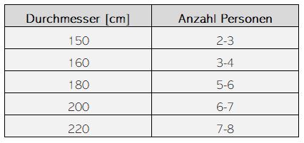 Je nach Anzahl Personen ist ein kleineres oder grösseres Bad notwendig. In untenstehender Tabelle finden Sie den Durchmesser und die entsprechende Anzahl Personen, die im Bad Platz finden.