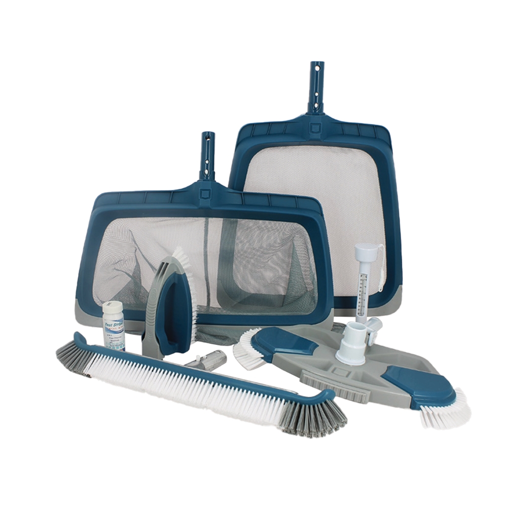 Das Set umfasst eine Bodenbürste, eine Wandbürste, einen Bodenkescher, einen Oberflächenkescher, eine Handbürste, ein Thermometer und 1 Schachtel mit 50 Teststreifen (Chlor, pH-Wert und Alkalität).