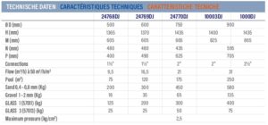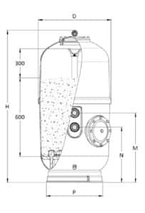 Der ASTER HIGH ist ein laminierter Filter aus Polyester und Glasfaser. Er hat einen Sandablaufanschluss von Ø 200 mm an der Unterseite des Filters, sowie eine schwarze Schraubabdeckung für den 1/4-Zoll-Wasserablaufanschluss an der Unterseite des Filters. Der maximaler Druck beträgt 2,5 bar und die maximale Temperatur 50°C.
