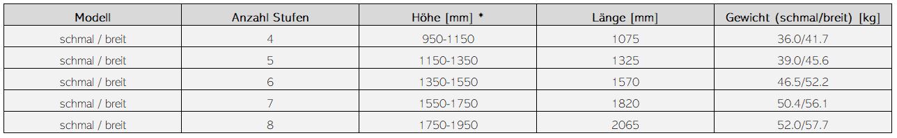 Bitte beachten Sie die untenstehende Tabelle, um die passende Schwimmbadtreppe zu finden: