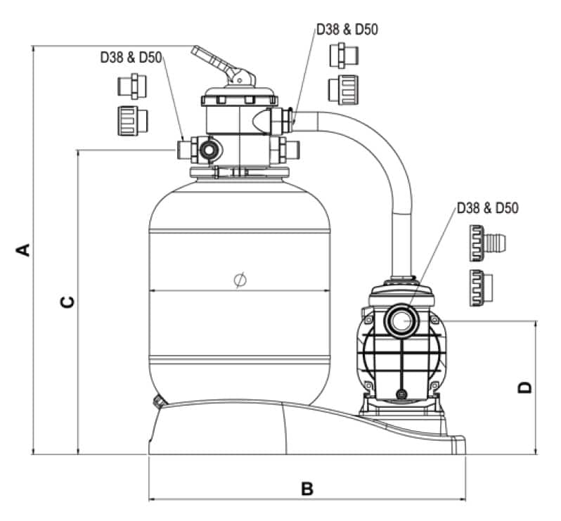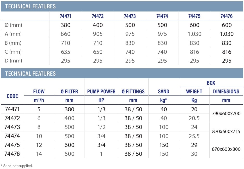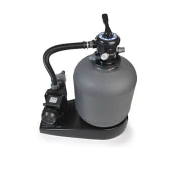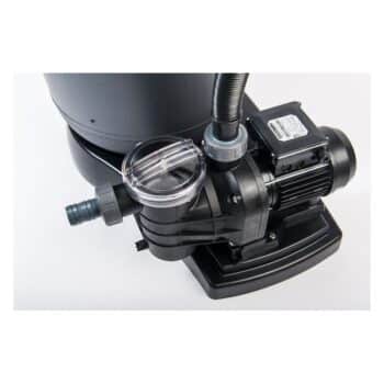Der Filter ist aus hochbeständigem, blasgeformtem Thermoplast. Er enthält ein 6-Wege-Mehrwegeventil, ein Manometer, eine manuelle Luftspülung, eine Wasserspülung, eine kompakte selbstansaugende Pumpe mit Stromkabel und Stecker, einen Schlauch, eine Armaturen, einen Sockel und Zubehör zur vollständigen Montage des gesamten Sets.