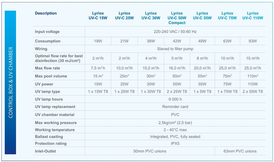 Erschwingliche und nachhaltige UV-C-Behandlungslösung für Pools und Spas. Bei der Behandlung mit UV-Lampen strömt das gesamte Wasser im Pool ständig durch das Desinfektionssystem und wird dort der Strahlung der UV-Lampen ausgesetzt. Der Einsatz von Chemikalien zur Wasserdesinfektion wird dadurch drastisch reduziert. Der LYRIOX UV-C ist kompakt und einfach zu installieren. Er ist korrosionsfrei, er besteht aus 100 % PVC, daher ist er für den Einsatz in Verbindung mit Salzwasser geeignet. Er hat ein kompaktes, integriertes Gehäuse. Er hat eine hochwertige UV-C-Lampen (9 000 h) und wird mit einem 50 mm (15 bis 50 W) oder 63 mm (55 bis 100 W)Anschlüssen geliefert.
