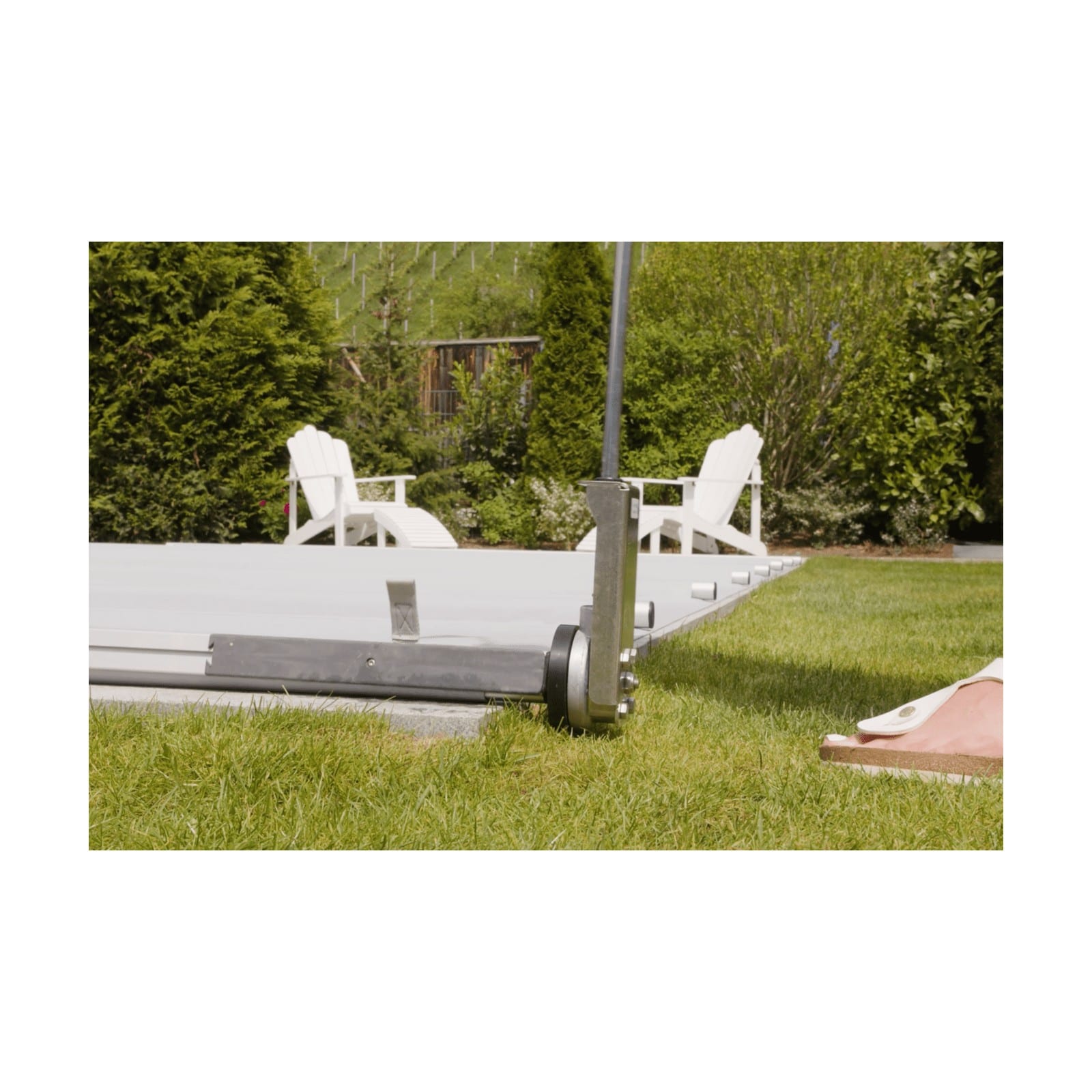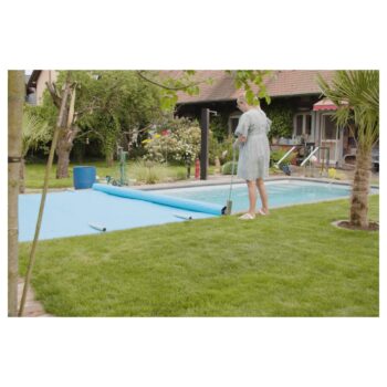 Der „Rolltrot“ gibt Ihnen die Möglichkeit den Rollschutz mit motorischer Unterstützung aufzurollen. Der Antriebsdorn des akkubetriebenen Gerätes wird in die Öffnung der Kurbelstange gesteckt. Durch einen dauerhaften Druck auf den Bedienknopf wird der „Rolltrot“ betätigt. Der Beckenrand muss mindestens eine Breite von 50 cm haben.