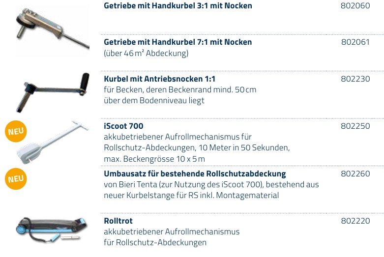 Bei der handbetriebenen Variante wird im Standard eine 3:1-Getriebehandkurbel verwendet. Bei grösseren und längeren Becken erfolgt die Bedienung mit einer 7:1-Kurbel. Für aus dem Boden stehende Becken bieten wir eine einfache Kurbel ohne Übersetzung an.