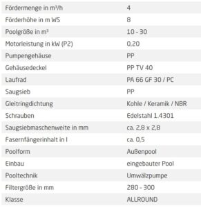 Schwimmbadwasser-Umwälzpumpe in Filteranlagen für Klein- und Aufstellbecken bis 30 m³. Aufstellbar max. 1,5 m oberhalb oder max. 3 m unterhalb des Wasserniveaus.