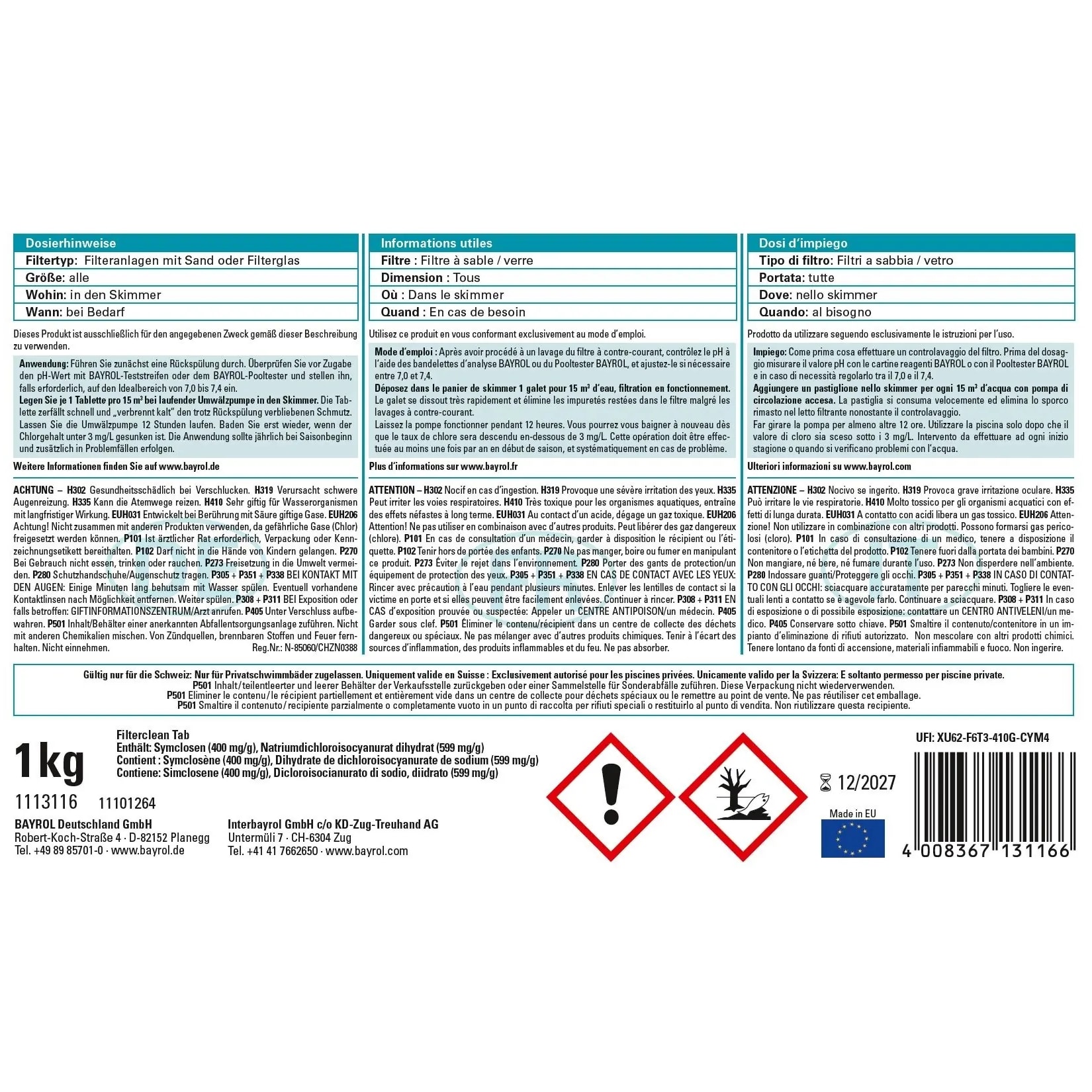 Die BAYROL FilterClean Tabletten ist ein 1 kg Behälter. Die Tabletten sind speziell entwickelte Reinigungstabletten zur intensiven Reinigung und Desinfektion von Sand- und Glasfilteranlagen. Die patentierten 200 g Chlortabletten entfernen zuverlässig organische Ablagerungen, Bakterien und Verunreinigungen, die selbst durch regelmässiges Rückspülen nicht vollständig beseitigt werden.