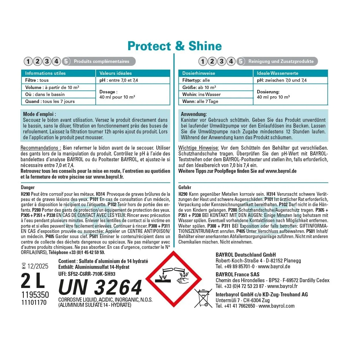Das BAYROL Protect & Shine 2 l ist ein innovatives 2-in-1 Flüssigkonzentrat zur gleichzeitigen Reinigung und Pflege von Poolwasser und Oberflächen. Die spezielle Brillanz-Formel entfernt zuverlässig Kalk-, Schmutz- und Fettablagerungen und sorgt gleichzeitig für sichtbar klareres, funkelndes Wasser.