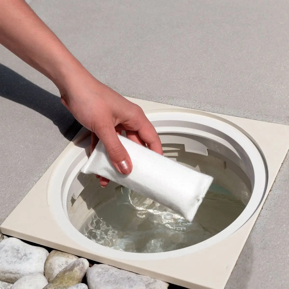 Die Anwendung ist besonders einfach: Nach dem Rückspülen wird eine Kartusche in den Skimmer gelegt, wo sie ihre Wirkung bei laufender Umwälzung entfaltet. Eine Kartusche reicht für bis zu 50 m³ Wasser und sorgt bei regelmässiger Anwendung für dauerhaft klares und gepflegtes Poolwasser.