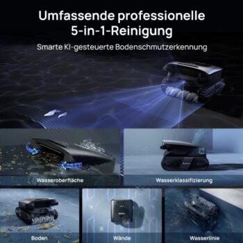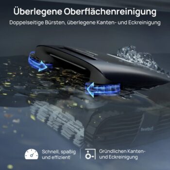 - Doppel-Seitenbürstensystem (für eine bessere Reinigung der Wasseroberfläche), Vier extragroße Walzenbürsten