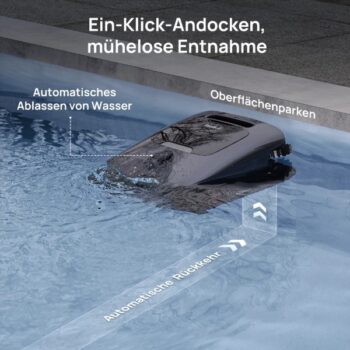 Der Roboter kehrt nach Abschluss der Reinigung oder bei niedrigem Batteriestand automatisch zum Beckenrand zurück und parkt über der Wasseroberfläche. Gleichzeitig sorgt der SmartDrain dafür, dass das Wasser automatisch abgelassen wird, wodurch das Herausheben zum Kinderspiel wird. Lassen Sie schweres Heben und mühsames Herausfischen hinter sich!