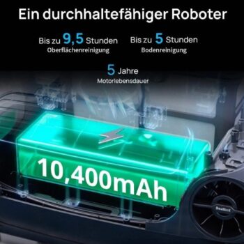 - 5 Reinigungsmodi: Schnellmodus: Boden (1 Mal), Standardmodus: Boden, Wände und Wasserlinie (1 Mal), Pro-Modus: Boden, Wände, Wasserlinie und Oberfläche (1 Mal), ECO-Modus: reinigt den Boden jeden zweiten Tag (1 Mal), benutzerdefinierter Modus