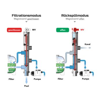 Um das Magnetventil zu programmieren und zu steuern, benötigen Sie eine einfache elektrische Steuerung/Zeitschaltuhr von 230V. Das Magnetventil bekommt den elektrischen Impuls und öffnet sich. Der Eingangsdruck komprimiert die Feder im Inneren des BESGO Ventils und startet somit die Rückspülung. Die Rückspülung dauert so lange wie gewünscht. Voraussetzung ist jedoch, dass das Ventil während diesem Vorgang mit Strom versorgt wird. Im Falle eines Stromausfalls schaltet das BESGO Ventil automatisch wieder in den “Filtrationsmodus” zurück. Ein unbeabsichtigtes Entleeren des Beckens ist nicht möglich