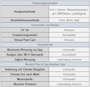 - Hochmoderne Technologie: Blue Connect misst dank seines 4-in-1 Sensors kontinuierlich und präzise den pH-Wert, den Desinfektionsmittelgehalt, die Leitfähigkeit und die Temperatur des Wassers.