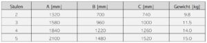 Bitte beachten Sie die untenstehende Masszeichnung und Tabelle, um die passende Einbauleiter zu finden: