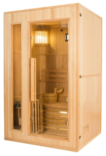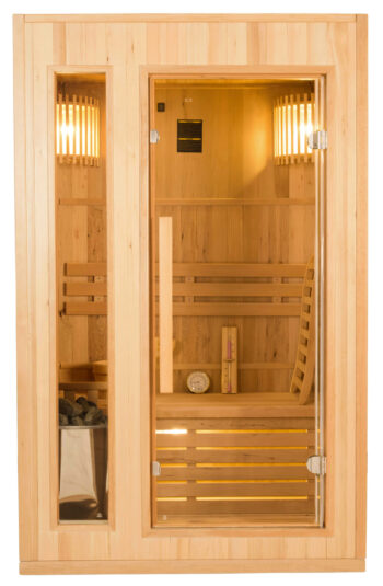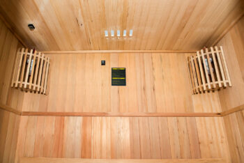Die Sauna ist je nach Modell mit einer ein- oder zweigeschossigen Bank erhältlich und verfügt über eine sanfte Beleuchtung in der oberen Ecke und unter der Bank für eine entspannte Wohlfühlatmosphäre.