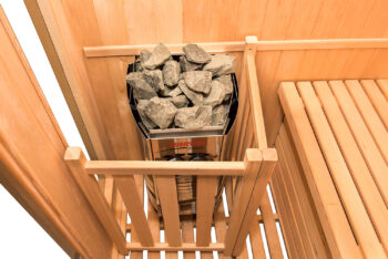 Der Edelstahlofen der ZEN-Sauna mit einer Leistung von 3,5 bis 4,5 kW und seinen Lavasteinen bildet hier keine Ausnahme. Er heizt die Kabine optimal auf, damit Sie alle Vorteile Ihrer Entspannungssitzung geniessen können.