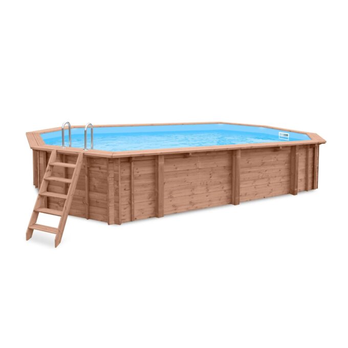 Dieser Holzpool ist in einer ovalen Ausführung 8.40 x 4.90 m erhältlich. Die Höhe beträgt 1.36 m.