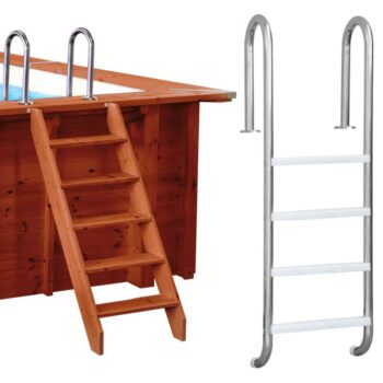 Um den Einstieg in den Holzpool einfach und sicher zu gestalten ist eine hochwertige 4-sprossige Edelstahl V2A Leiter im Lieferumfang enthalten. Die Tritte sind extra breit und rutschfest.