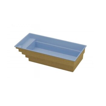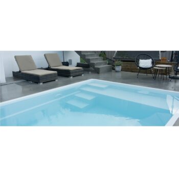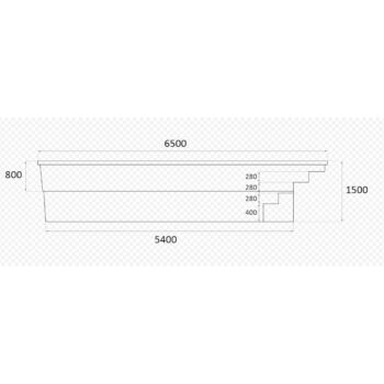 Diese Poolvariante hat eine schmale Treppe mit einer Bank, welche sich über die Restbreite zieht. Der Pool hat die Masse: 6.50 m x 3.20 m x 1.50 m.