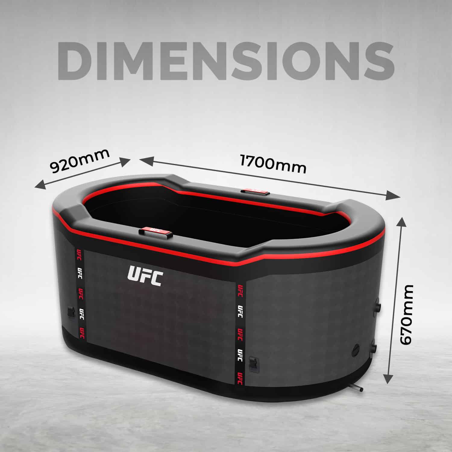 Praktisch ideal für Sportler: Mit seinen angepassten Abmessungen (1700 mm x 670 mm x 920 mm x 1000 mm x 900 mm) und innovativen Materialien wurde das Eisbad UFC DUO für eine einfache und schnelle Anwendung konzipiert, wobei er transportabel und für den Aussenbereich geeignet ist.