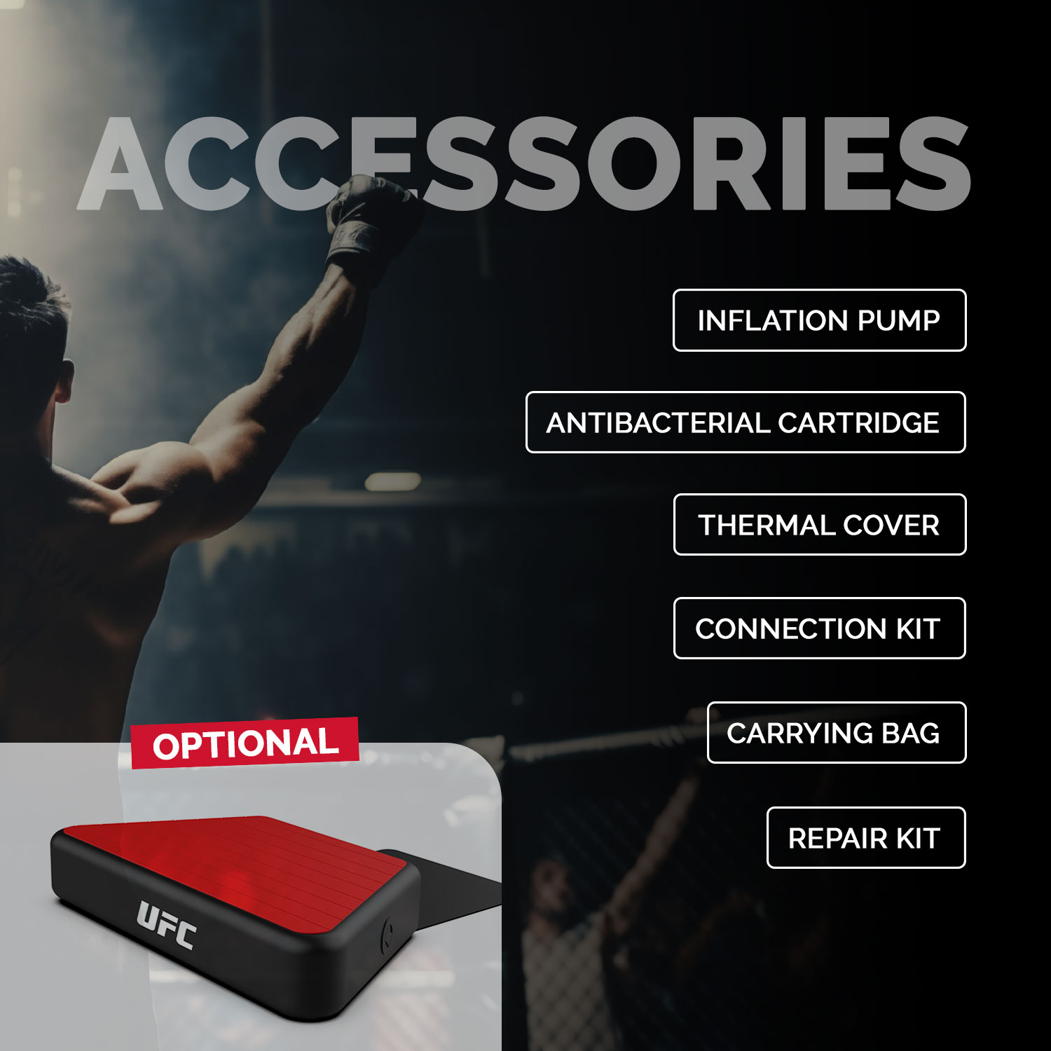 Es wird mit einem kompletten Paket geliefert (Aufblaspumpe, Wärmedecke, Tragetasche, Anschlussset und antibakterielle Kartusche) und garantiert ein optimales Erlebnis zu Hause oder unterwegs. Das Eisbad UFC DUO ist die ideale Lösung, um Erholung und Leistung zu optimieren.