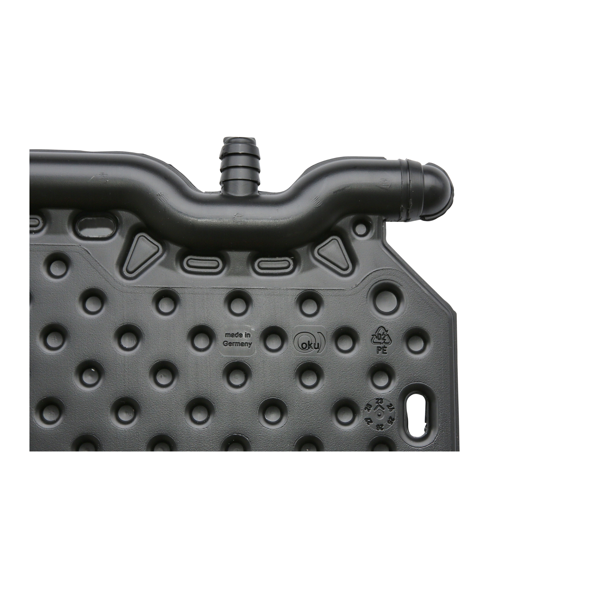 Bei den OKU Max – Absorber sind alle Wasser Ein- und Ausgänge verschlossen. Je nachdem wie die Solarabsorber angeschlossen werden sollen, müssen die dafür benötigten Anschlüsse mit einer Säge aufgeschnitten werden. Alle Anschlüsse werden werkseitig verschlossen geliefert. Damit haben die OKU Max – Absorber eine hohe Flexibilität beim Anschliessen, ohne das extra Zubehör benötigt wird, um offene Ein- und Ausgänge wieder zu verschliessen.