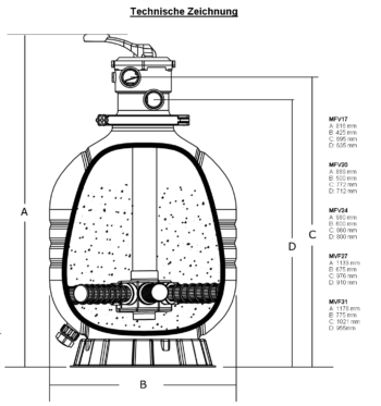 | Artikelnummer | Typ | Durchmesser | Max. Durchfluss | Sandmenge | Max. Poolvol. | Maße |