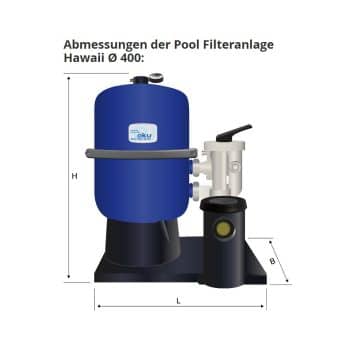 Die Hawaii Sandfilteranlage eignet sich für Pools mit einen Beckenvolumen von bis zu 50 m³. Durch den teilbaren Filterbehälter ist es sehr einfach den Filtersand in den Filterbehälter einzufüllen oder zu tauschen. Als Filterpumpe wird eine Pumpe von der Firma Speck oder Aqua Technix verwendet.