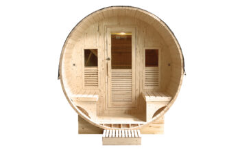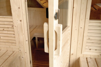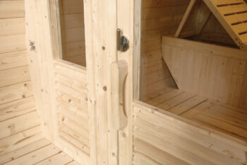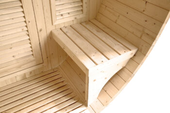 Die Gaïa Luna ist aus massivem Fichtenholz gefertigt und verfügt über eine klappbare Komfortbank. Ihr abgerundetes Design optimiert die Luft- und Wärmezirkulation, die sich gleichmässig in der Kabine verteilt.
