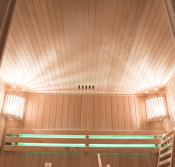 Wasserfeste Lampen, die ein angenehmes Licht verströmen, sind in den oberen Ecken der Sauna installiert. Ausserdem sorgen LED-Bänder integriert in den Nackenstützen für unterschiedliche Stimmungen.