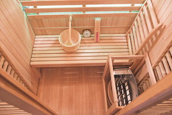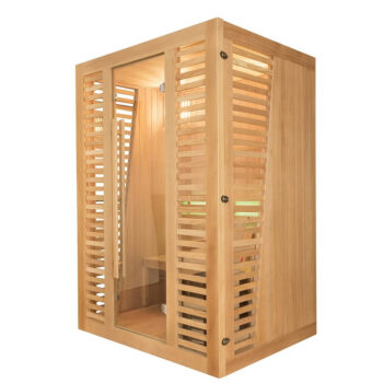 Die neue Sauna Venetian wird Sie mit ihrer lichtdurchlässigen Frontseite überzeugen. So können Sie die Privatsphäre einer geschlossenen Sauna geniessen, ohne sich eingesperrt zu fühlen. Die komfortable Bank aus massivem Abachi-Holz lädt zum Entspannen ein, während der hochqualitative elektrische Ofen eine sanfte und angenehm feuchte Wärme generiert.