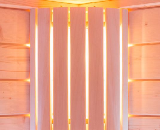 Die Saunakabine der Polaris Large ist aus massivem Fichtenholz gefertigt und verfügt über ein massives Dachelement mit Dachkranz. Die Innenverkleidung und -ausstattung ist aus Lindenholz gefertigt. Lindenholz hat eine sehr weiche und warme Farbe, was der Saunakabine ein angenehmes Wohlfühl-Ambiente verleiht. Die Glasfront ist in einer Grösse dimensioniert, sodass Sie sich zu keinem Zeitpunkt beengt fühlen.