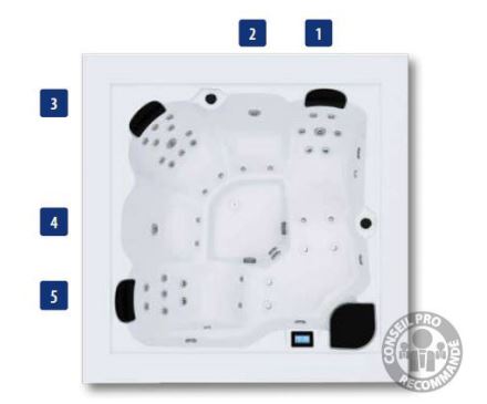 Mit dem Touch Panel können Sie alle möglichen Funktionen rund um Ihren Whirlpool regeln: die Temperatur (26-40 °C), die chromatische Reihenfolge in der Farbtherapie, die Betriebsart, die Programmierung der Filterzyklen. Der Speicher im Touch Panel speichert vorkonfigurierte Funktionen. Auch für Sicherheit ist gesorgt: Mit dem Touchpanel haben Sie Zugriff auf das Selbstreinigungssystem für die Rohrleitungen, den Frostschutz, das automatische Ausschalten der Pumpen und des Projektors und Diagnosemeldungen. Sofern Sie das optionale Audiosystem auch wünschen, kann die Musik über das Touch Panel gesteuert werden (Lautstärkeregelung, Musikwahl in der Wiedergabeliste, etc.).