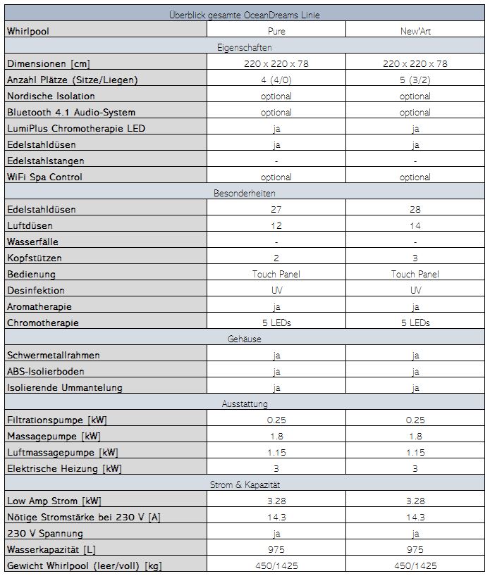 Sie können sich nicht entscheiden? Nutzen Sie untenstehende Tabelle, um Ihren Traumwhirlpool der OceanDreams Serie zu finden!