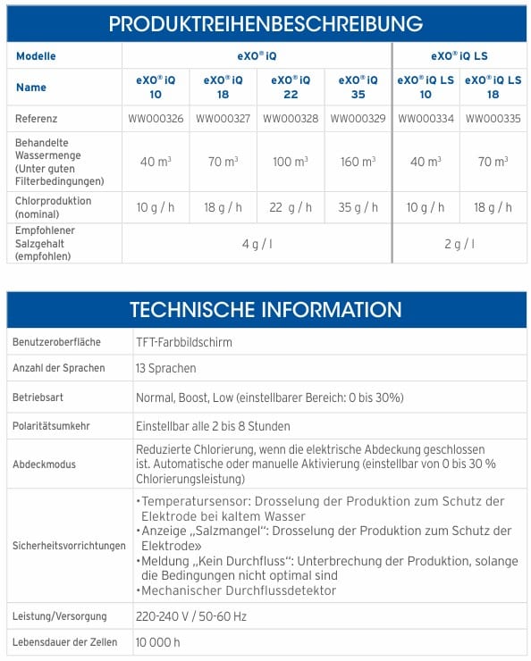 Die ZODIAC Salzelektrolyse-Anlagen eXO® stehen für automatische, effiziente und umweltfreundliche Wasseraufbereitung. Sie sind einfach zu bedienen und bieten eine vollständige Wasseraufbereitung mit weniger Wartung. Geniessen Sie alle Vorteile der Salzelektrolyse: sanfter zu Ihrer Haut und umweltfreundlicher. Dank seiner intelligenten Steuerung garantiert er eine automatische und kontinuierliche Wasserbehandlung, sodass Sie jederzeit gesundes Wasser geniessen können. Tauchen Sie mit voller Sicherheit in Ihren Pool ein und werfen Sie einen einfachen Blick auf die wichtigsten Daten auf dem neuen intuitiven Bildschirm. Für Ihre absolute Sicherheit verfügt er über eine langlebige Elektrode. Die Desinfektion Ihres Beckenwassers ist sichergestellt, ohne dass Sie weitere Chemikalien hinzugeben müssen, während der Wartungsaufwand geringer ist. Für ein rundum sorgenfreies Badevergnügen können Sie die Salzelektrolyse mit einem pH-Regulierer verbinden. Für alle Arten von Pools.