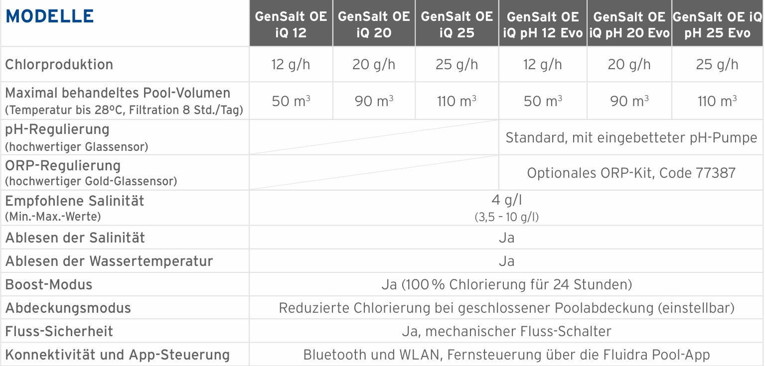 Dank der langlebigen Quick Fix-Zelle sorgt es für eine effiziente, umweltfreundliche und wartungsarme Poolpflege. Die Quick Fix-Zellen gehen für 50 und 63 mm Rohre. Sie sind mit Titanplatten in hoher Qualität ausgestattet. Das kompakte und vielseitige Design ermöglicht eine einfache Integration in alle Poolgrößen. Das Salzelektrolysegerät GenSalt OE IQ ist entweder in der Standardversion (nur Salzwasser-Chlorinator) oder in der evolutiven Version (EVO) mit bereits integrierter pH-Regulierung und optionaler ORP-Regulierung für eine umfassende Wasseraufbereitung erhältlich.