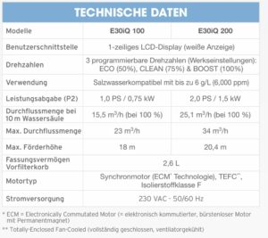 Dank ihrer variablen Drehzahl können E30iQ-Pumpen länger auf niedrigerer Drehzahl laufen, dadurch wird der Stromverbrauch um bis zu 80 % verringert. Mit ihren 3 programmierbaren Drehzahlen in einem Bereich von 40 bis 100 % der vollen Drehzahl, können Sie die Pumpe den Anforderungen Ihres Schwimmbads entsprechend anpassen und dabei Ihren Stromverbrauch optimieren.